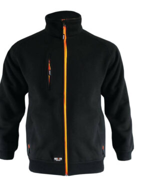 Jauge 7. Anti-peluche. Col montant zippé. Tissu renforcé aux épaules et coudes. Col, poignets et taille en bords côte. Poche poitrine avec fermeture Velcro® et ouverture à rabat pour stylos.