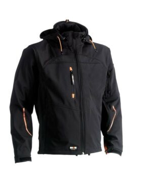 Veste Softshell respirante, déperlante et coupe-vent. Respirante 500 mvp. Imperméable 5000 mm. 2 poches latérales. Poignets ajustables. Taille ajustable. Fermeture éclair amovible.