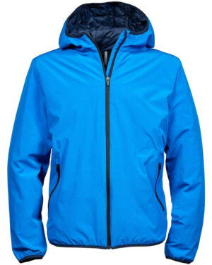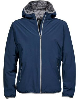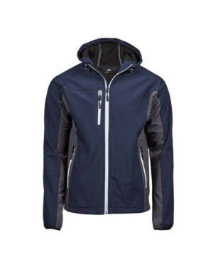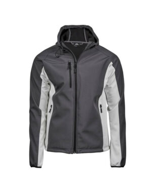 Veste de sport Softshell 2 couches. Grand zip. Bonne isolation grâce à la qualité du rembourrage DuPont™. Capuche intégrée avec liseré contrasté et coutures décoratives. Protège-menton. 2 poches latérales zippées….