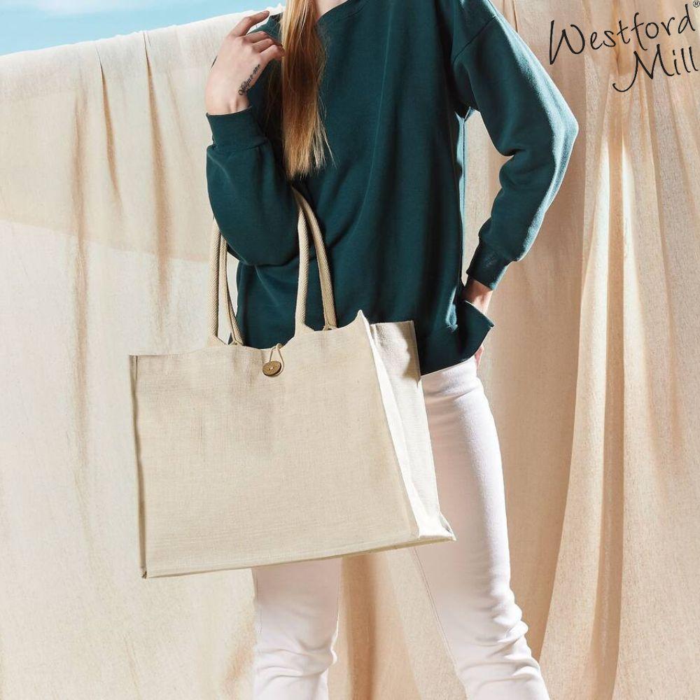 Sac en toile de jute. Longueur des anses 40cm. Panneau de marquage côté. Surface d’impression : 25x20cm.