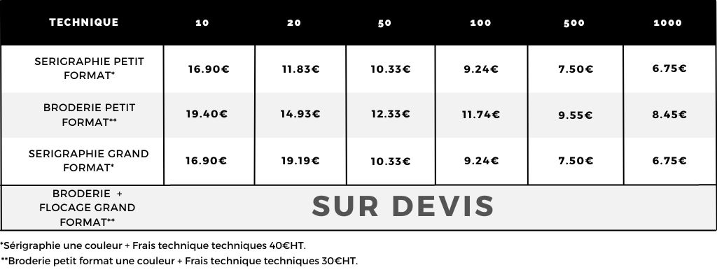 Les techniques comme le flocage, la sérigraphie et la broderie conviennent parfaitement pour la personnalisation.