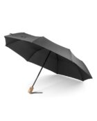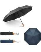 Parapluie en rPET 190T pongé, avec mâts en fibre de verre et poignée en bois. Parapluie pliable en 3 parties, avec ouverture et fermeture automatiques et coupe-vent. Fourni dans un sac.